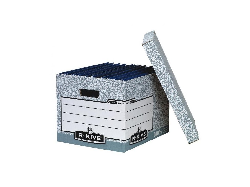 Krabica s odnímateľným vekom a bočnými výrezmi na uchytenie. Mierne zväčšené veko umožňuje uskladnenie dokumentov archivovaných v závesných obaloch. Kompatibilná s archívnymi boxami. Dodávaná v rozloženom stave naplocho. Väčšie balenie 10 ks. Farba sivá/-biela.Rozmery v cm: 32,5x28x38,5