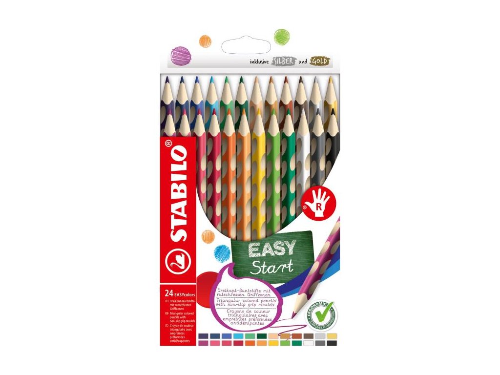 STABILO EASYcolors. Ergonomické trojhranné farbičky pre predškoské deti a školákov od 5 rokov. Prvá ergonomická farbička špeciálne pre ľavákov a pravákov. Trojhranný tvar a nekĺzavé úchopové plôšky zaisťujú uvoľnené držanie ruky. Žltý alebo červený koniec farbičky označuje ľavú alebo pravú verziu. Brilantné farby v dreve z udržateľného lesného hospodárstva. Farbičky sú vyrobené z dreva certifikovaného PEFC® (PEFC/04-31-1728). Každá farbička má štítok na meno.Dodatočné parametre