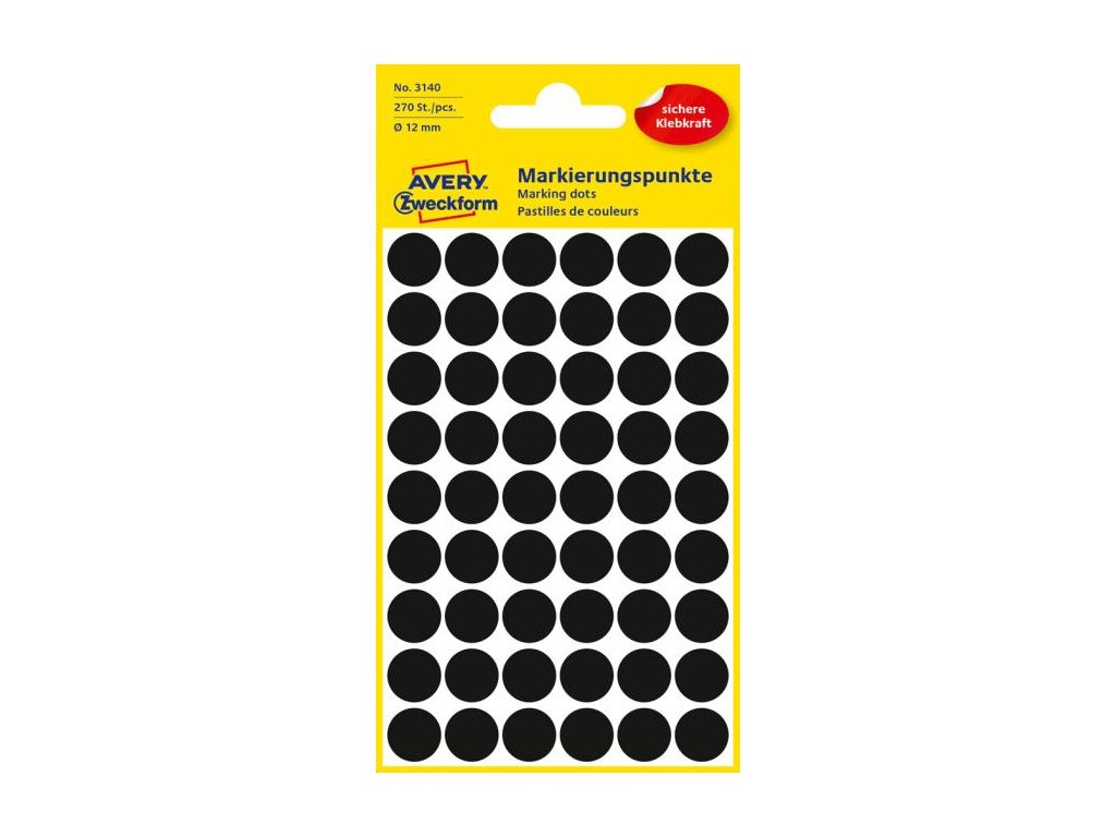 Kruhové etikety na ručný popis. Priemer 12 mm, v balení 270 etikiet. Farba čierna.Dodatočné parametre