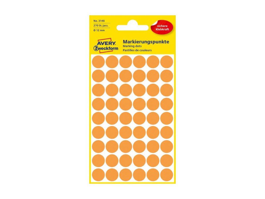 Kruhové etikety na ručný popis. Priemer 12 mm, v balení 270 etikiet. Farba neónová oranžová.Dodatočné parametre