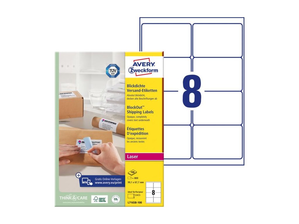Biele etikety vhodné ako prepravné štítky na zásielky. Vďaka inovatívnej technológii ultragrip sa môžete spoľahnúť na bezchybné natiahnutie archu a tlač bez zasekávania. Bezpečnostný okraj QCT zabraňuje zanášaniu tlačiarne lepidlom. Rýchla technológia QuickPEEL™ zabezpečí, že etiketu odlepíte z podkladového papiera za sekundu. Šablóny a softvér pre jednoduchú a rýchlu tlač etikiet sú k dispozícii zdarma na www.avery-zweckform.cz/software/avery-design-print. Sú vhodné pre všetky štandardné laserové tlačiarne. Pre laserové tlačiarne testované a certifikované TÜV SÜD. Rozmer 99,1 x 67,7 mm. Balenie 100 hárkov.Dodatočné parametre