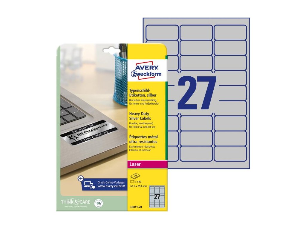 Veľmi odolné polyesterové etikety odolné voči oleju, prachu, špine, natrhnutiu, vode. Odolávajú teplotám od −40 ° do + 150 °C. Určené pre tlač v laserových tlačiarňach. Vhodné aj pre vonkajšie použitie. Rozmery v mm : 63,5 × 29,6. Farba strieborná. Etikety na hárku 27 kusov. Balenie 20 hárkov.Dodatočné parametre