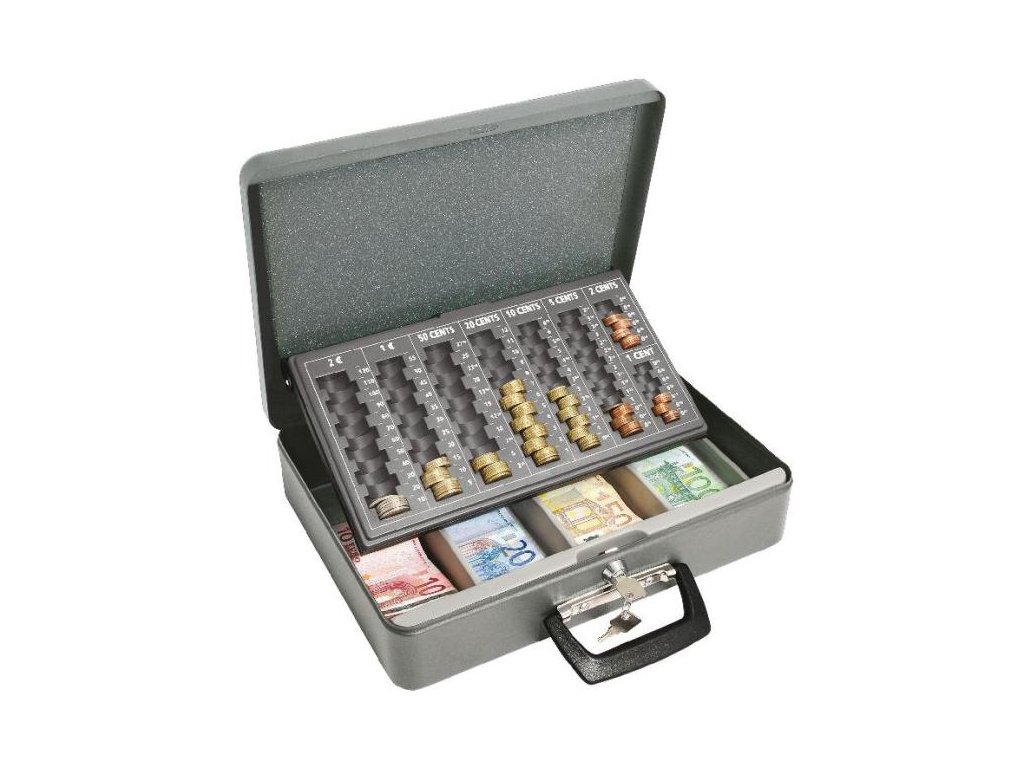 Pokladnička vybavená mincovou priehradkou s ôsmimi oddielmi na eurá a centy a štyrmi prístupnými priehradkami na bankovky. Pena na vnútornej strane veka na zabránenie premiešania mincí pri prenose, dve madlá na prenos pokladničky. K zámku sú dodávané dva kľúče.Rozmery: 370×100×280 mm