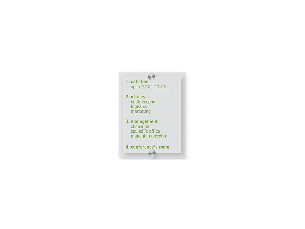 Informačný dverné tabuľka určená pre vnútorné použitie ako ideálne riešenie orientačného systému a označenie. Skladá sa z dvoch dosiek vyrobených z priehľadného plexiskla. Na krátkych stranách dosky sú umiestnené dekoratívne skrutky z nerezovej ocele pre elegantný a moderný vzhľad a bezpečné uloženie informácií. Existuje možnosť zavesenia dosky ako vertikálne, tak horizontálne. Jednoduché a rýchle zostavenie. Pri použití číre fólie pre laserové tlačiarne napr. Folex BG 72 možno docieliť úplne transparentného efektu.Buďte prvý, kto napíše príspevok k tejto položke.