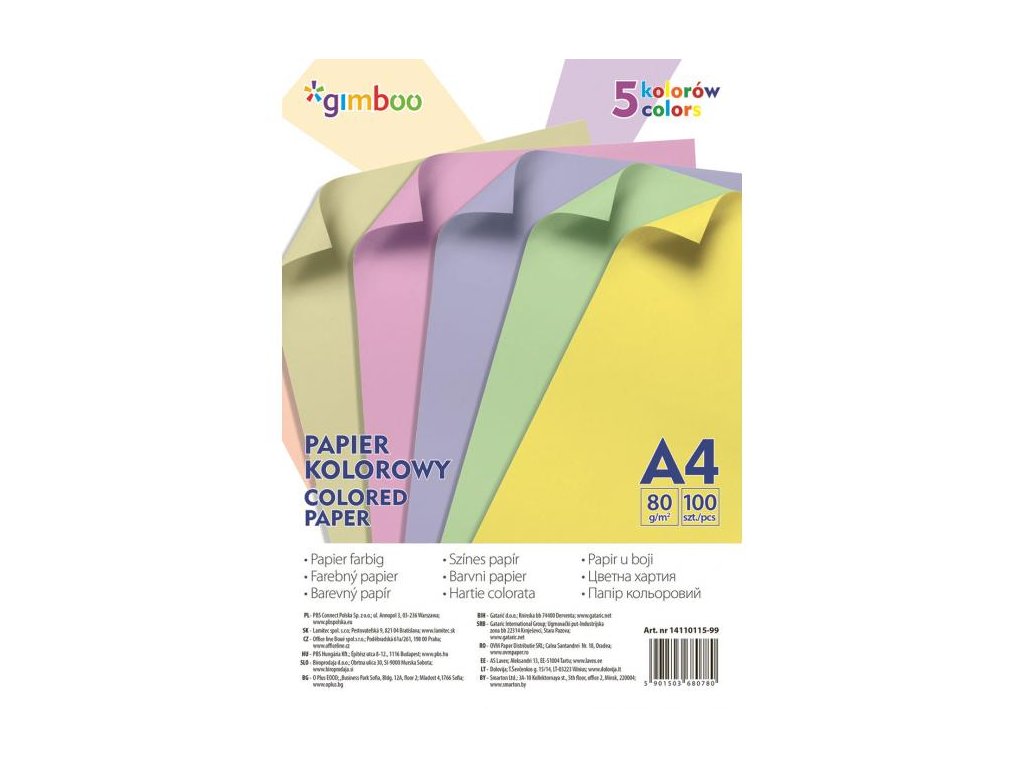 Farebný papier Gimboo A4, 100 listov, 80g, 5 pastelových farieb