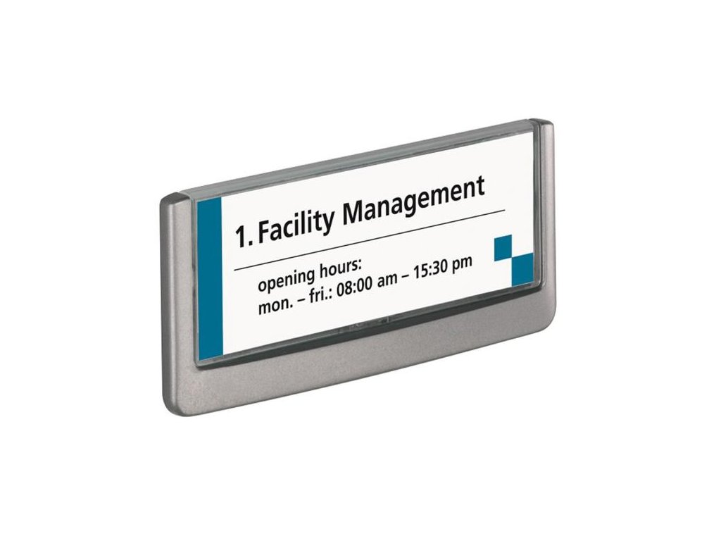 Moderná informačná tabuľka na dvere s lemom v atraktívnej grafitovej farbe. Predný panel sa otvára na jedno zatlačenie, a tým sa jednoducho sprístupnia vložené popisné papiere, ktoré sa môžu vymieňať podľa potrieb. Tabuľka je ideálna do kancelárií, úradov, škôl, univerzít a hotelov. Súčasťou balenia je montážna sada s názorným návodom. Namiesto pevného montovania môže byť tabuľka k povrchu aj prilepená.Rozmery: 149 x 52,5 mm