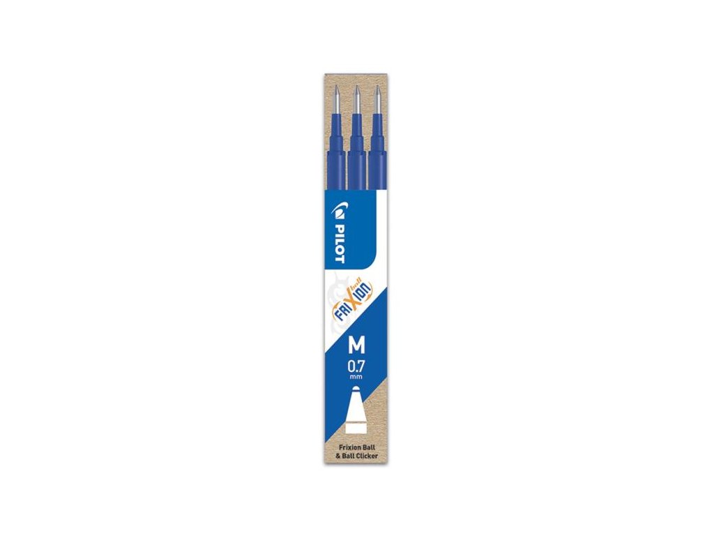 Náplň s prepisovateľným atramentom do rollerov Pilot FriXion Clickera FriXion Ball. V balení 3 ks. Gulička 0,7 mm.Farba modrá.