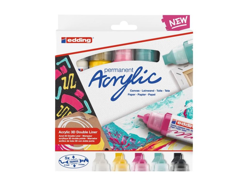 Obojstranná akrylová tuba edding 3D pre jedinečné efekty a maľovanie na tmavé a svetlé povrchy, ideálna na materiály ako plátno alebo maliarsky papier. Obojstranná tuba má dva rôzne hroty so šírkou stopy 2 - 3 mm a 5 - 10 mm. Vysoko kvalitná pigmentovaná akrylová farba na báze vody je po zaschnutí permanentná, nepriehľadná, svetlostála a bez zápachu. Súprava obsahuje čiernu, dopravnú bielu, dopravnú žltú, telemagentovú a pompéznu tyrkysovú farbu. Dodávaný v kvalitnom, znovu použiteľnom puzdre. Sada 5 kusov. Farba mix.