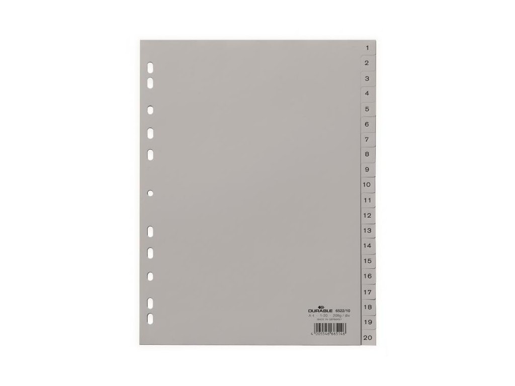 Číselný rozraďovač z polypropylénu. Formát A4, euro-dierovanie. Balenie jedna sada v polyesterovom sáčku. Väčšie balenie 20 sád. Farba sivá.Farba: sivá