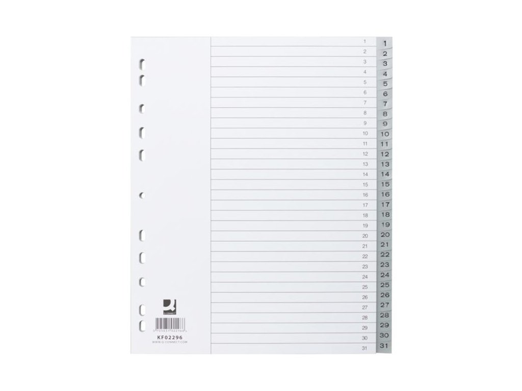 Rozšírený plastový rozraďovač formátu A4+ s eurodierovaním, 31‑dielny. Balenie jedna sada v polyesterovom sáčku.Väčšie balenie: 10 sád.