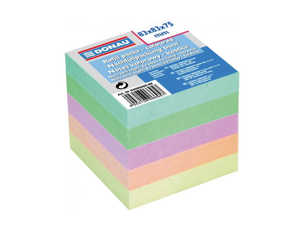 Farebné (pastelové farby) nelepené poznámkové bloky v tvare kocky. Vhodný ako samostatné poznámkové bloky alebo ako náplň do škatuľky DO491001.Rozmery 83x83x75mm.