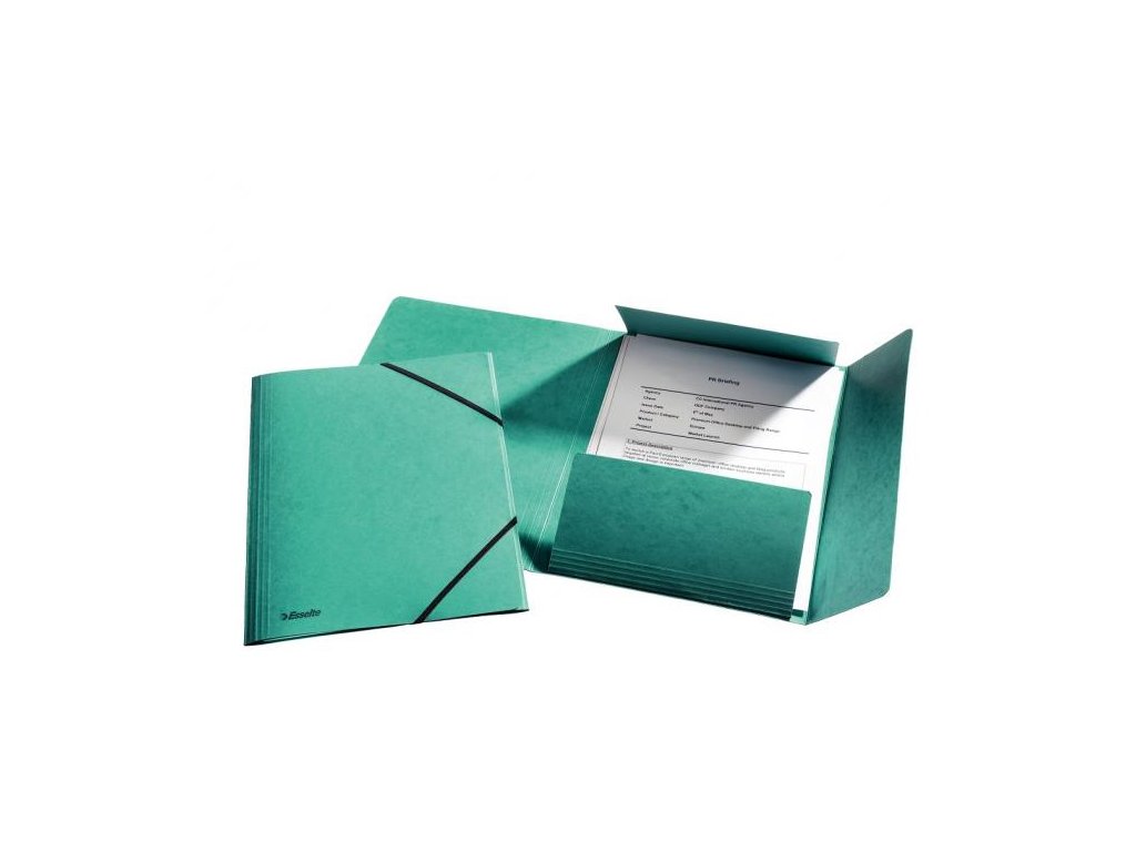 Obal A4 s tromi chlopňami a čiernou gumičkou. Materiál na dotyk príjemný prešpán. Prelisy na chlopniach a chrbte zvyšujú kapacitu obalu. Väčšie balenie 10 ks.Farba: zelená
