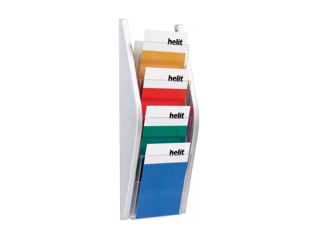 Nástenný stojan na prezentáciu materiálov. Štyri priehľadné priehradky slúžia na umiestnenie materiálov formátu A5. Materiál kvalitný plast. Rozmery (š x v x h) 215 x 540 x 80 mm. Farba strieborná.Buďte prvý, kto napíše príspevok k tejto položke.