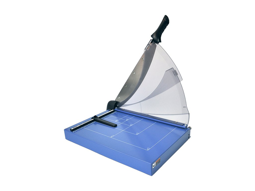 Výkonná páková rezačka s kovovým stolom a plastovým ochranným krytom. Prednosťou je automatický prítlak, ktorý sa aktivuje pohybom noža. Nôž je zo Solingen ocele s možnosťou výmeny alebo nabrúsenia. Skladacie ochranné plexi. Na stole je lišta s mierkou a zadným dorazom. Na ňom sú vyznačené bežné DIN formáty A3-A6. Dĺžka rezu 460 mm. Maximálna kapacita 40 listov (70g / m). Vhodné pre copycentrá aj zaťaženejšie prevádzky.Buďte prvý, kto napíše príspevok k tejto položke.