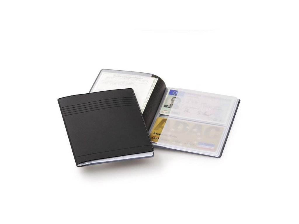 Puzdro so zatavenými priehľadnými vreckami na 4 platobné karty rozmerov 54×85 mm a 4 preukazy max. rozmerov 80×115 mm (technický, vodičský alebo občiansky). Farba čierna.Farba: čierna