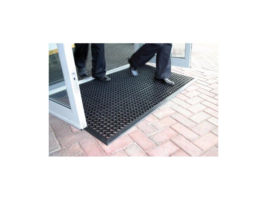 Protiúnavová exteriérová rohož vyrobená z oteruvzdornej pryže. Zvýšený kruhový povrch s otvormi poskytuje vynikajúcu protišmykovú ochranu, skosená hrana znižuje riziko zakopnutia. Výška rohože 14 mm. Rohož vyhovuje slovenským normám a nariadeniam.Rozmery: 90x150 cm