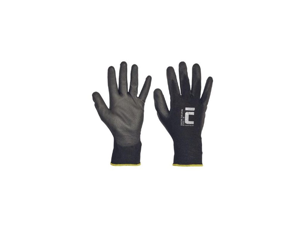 Pletené bezešvé polyesterové rukavice, s tenkou vrstvou polyuretanu v dlani a na prstech a pružnou manžetou.Materiál máčania: polyuretán