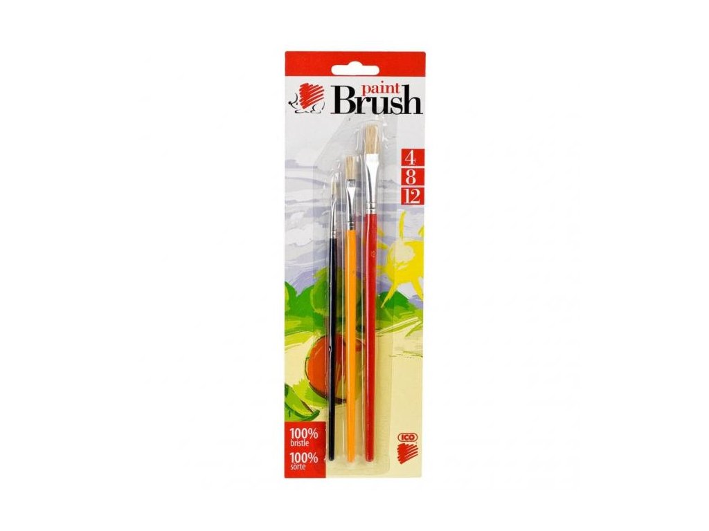 Sada 3 plochých školských štetcov s farebnou rúčkou. Štetina 100% poník. Ideálne na maľovanie vodovými a temperovými farbami. Šírka štetiny 4-8-12 mm.Dodatočné parametre