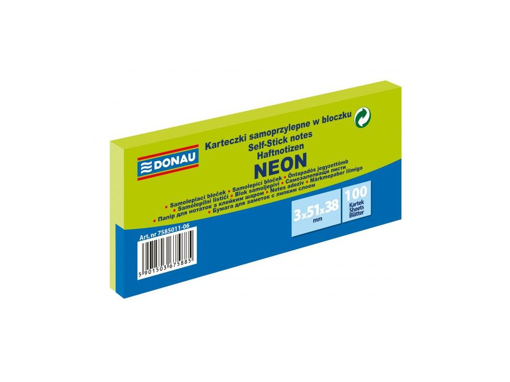 Univerzálne neónové samolepiace bločky z papiera gramáže 70 g / m², 100-lístkové, jednotlivo balené. Lepidlo nanesené po dlhšej strane, zmývateľné vodou. Udelený Green Point. 3 bločky vo fólii s červeným pruhom na uľahčenie otvárania. Väčšie balenie 36 ks. Farba zelená.Dodatočné parametre