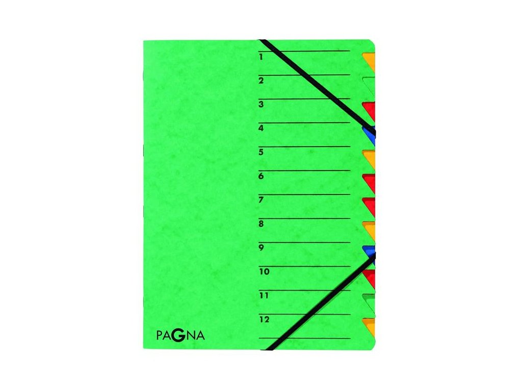 Triediaca zložka s 12 oddielmi, farebnými kartónovými listami a indexom, uzatvárateľná gumičkou. Možnosť popisu obsahu na titulnej strane.Farba vrchného obalu: zelená