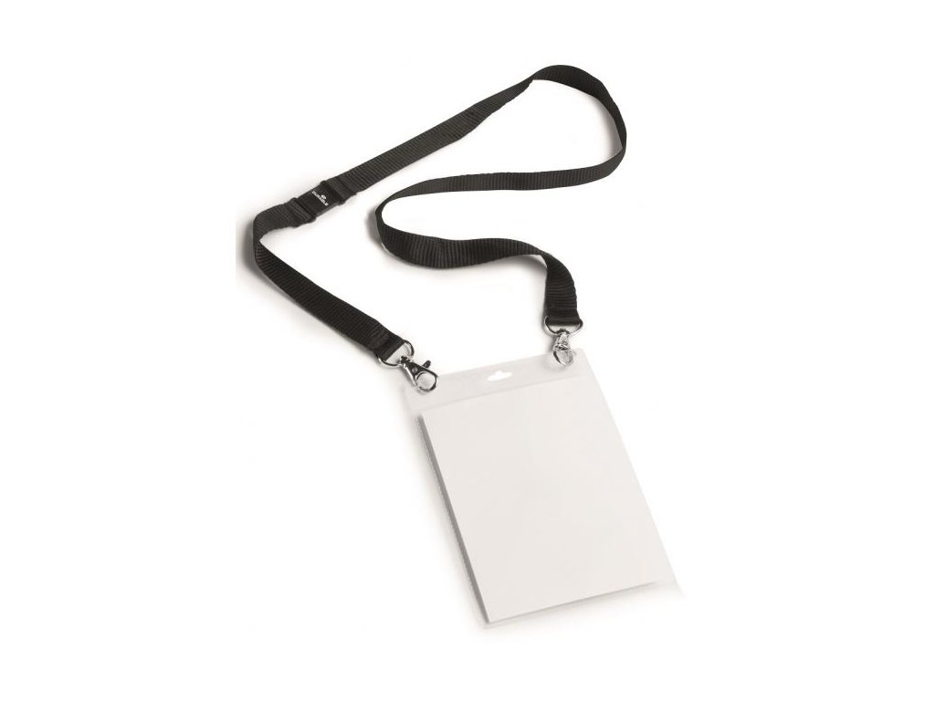 Visačka z PP s perforáciou na uchytenie a textilným remienkom šírky 20 mm s 2 karabínkami. Ideálna na vybavenie väčšieho počtu osôb na konferenciách, výstavách a pod. Dodávaná s etiketou formátu A6. Remienok čierny.Dodatočné parametre