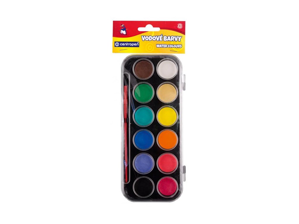 Vodové farby Centropen 9540 so štetcom. 12 farieb o priemere 30 mm.Dodatočné parametre